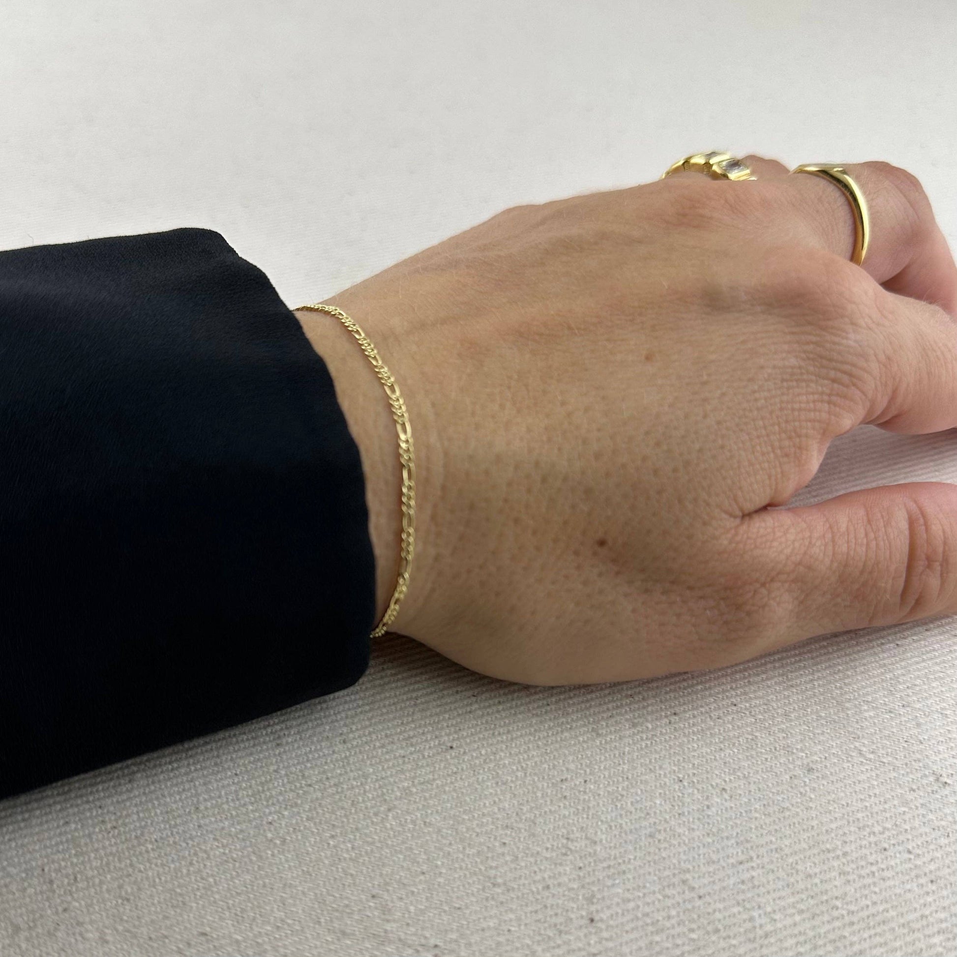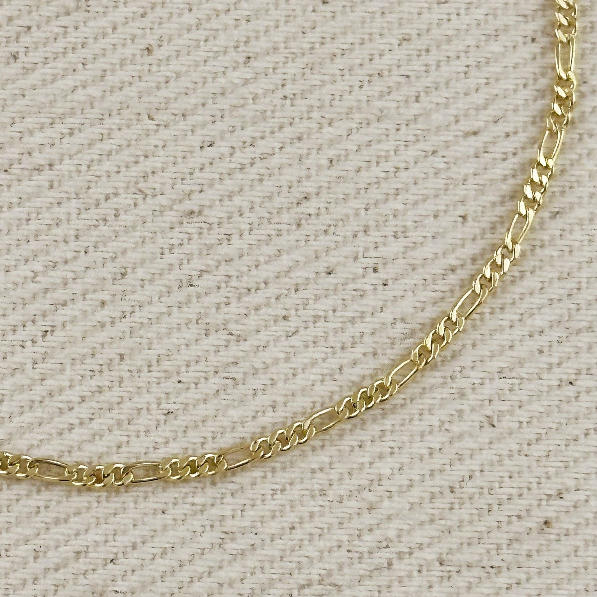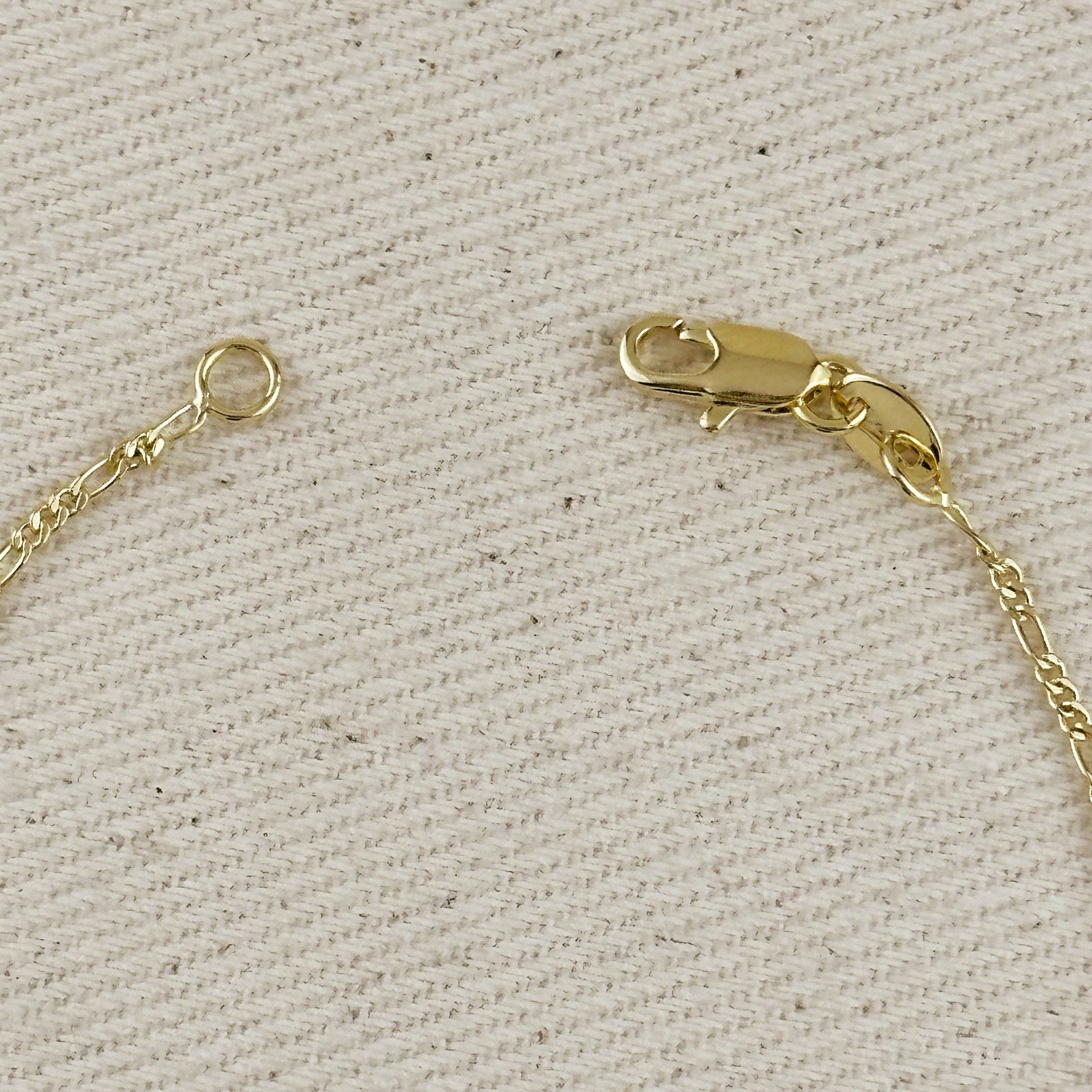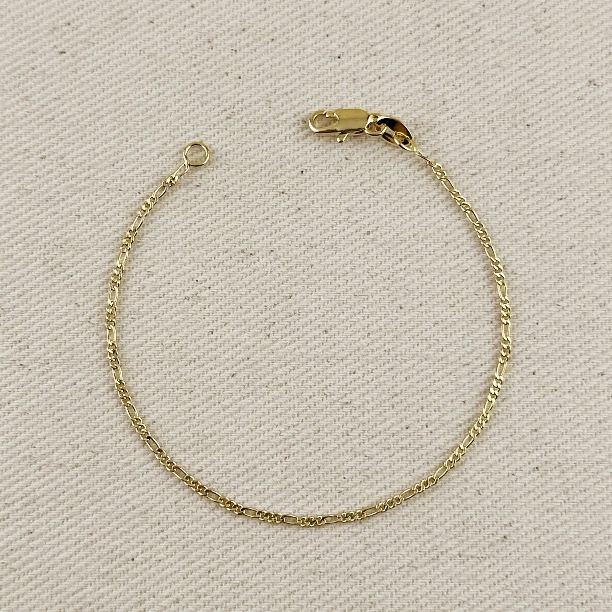 This delicate 18k Gold Filled 1.5mm Figaro Chain Bracelet offers refined elegance in a beautifully petite design. The classic Figaro pattern alternates between longer and shorter links in a slender 1.5mm width, creating subtle visual interest while maintaining a graceful, feminine aesthetic. The fine scale of this bracelet makes it perfect for those who prefer understated jewelry or enjoy layering multiple pieces together. * Metal: 18k Gold Filled * Size: 7 inches long * Hypoallergenic * Water-resistant *