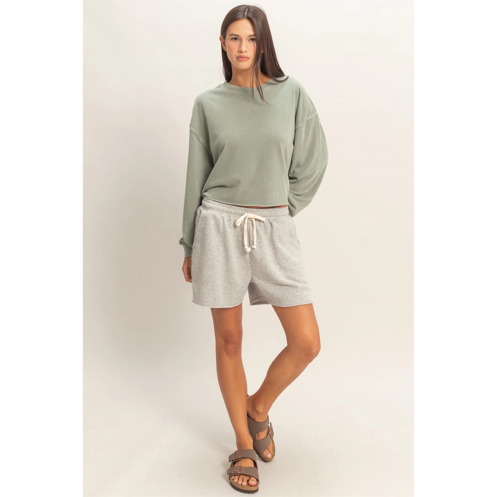 Meet your new everyday favorite. The Sunday Cropped Sweatshirt is the perfect blend of relaxed comfort and effortless style. Designed in a soft, lived-in fabric with a modern cropped length, this easygoing piece features a classic crew neckline, dropped shoulders, and a relaxed silhouette for that perfectly undone look. The muted sage tone pairs beautifully with denim, joggers, or your favorite lounge shorts, making it a go-to for slow mornings, school runs, coffee dates, and everything in between.