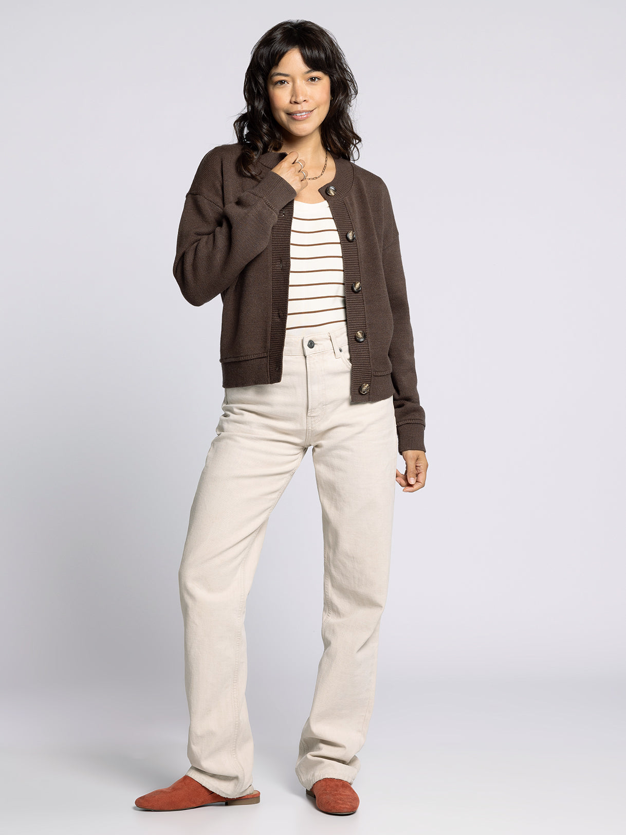 This button-front cardigan brings a fresh update to a classic silhouette. Featuring a round neckline, dropped shoulders, it’s designed for easy layering and effortless comfort. Ribbed trim at the collar, cuffs, and hem adds subtle texture, while the oversized buttons lend a modern, stylish detail. Perfect for pairing with high-rise denim or dresses, this cardigan is a versatile staple for any day of the week.