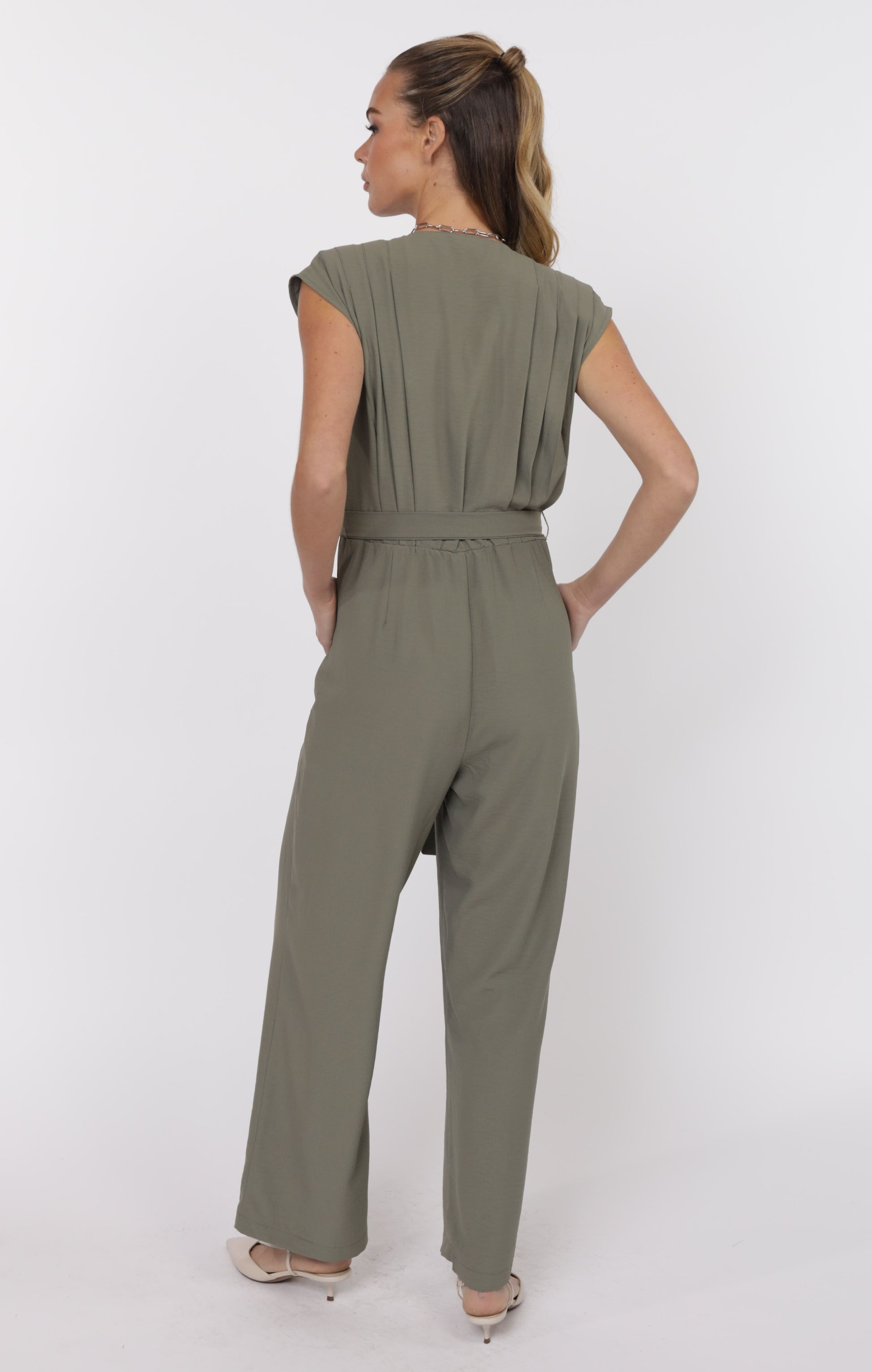 Step into easy sophistication with this olive-hued jumpsuit—where tailored structure meets relaxed charm. Featuring a button-down front and a flattering tie waist, it’s designed to define your shape while keeping you comfortable all day long. Subtle pleats add a touch of refinement, giving the silhouette soft movement and a polished finish.