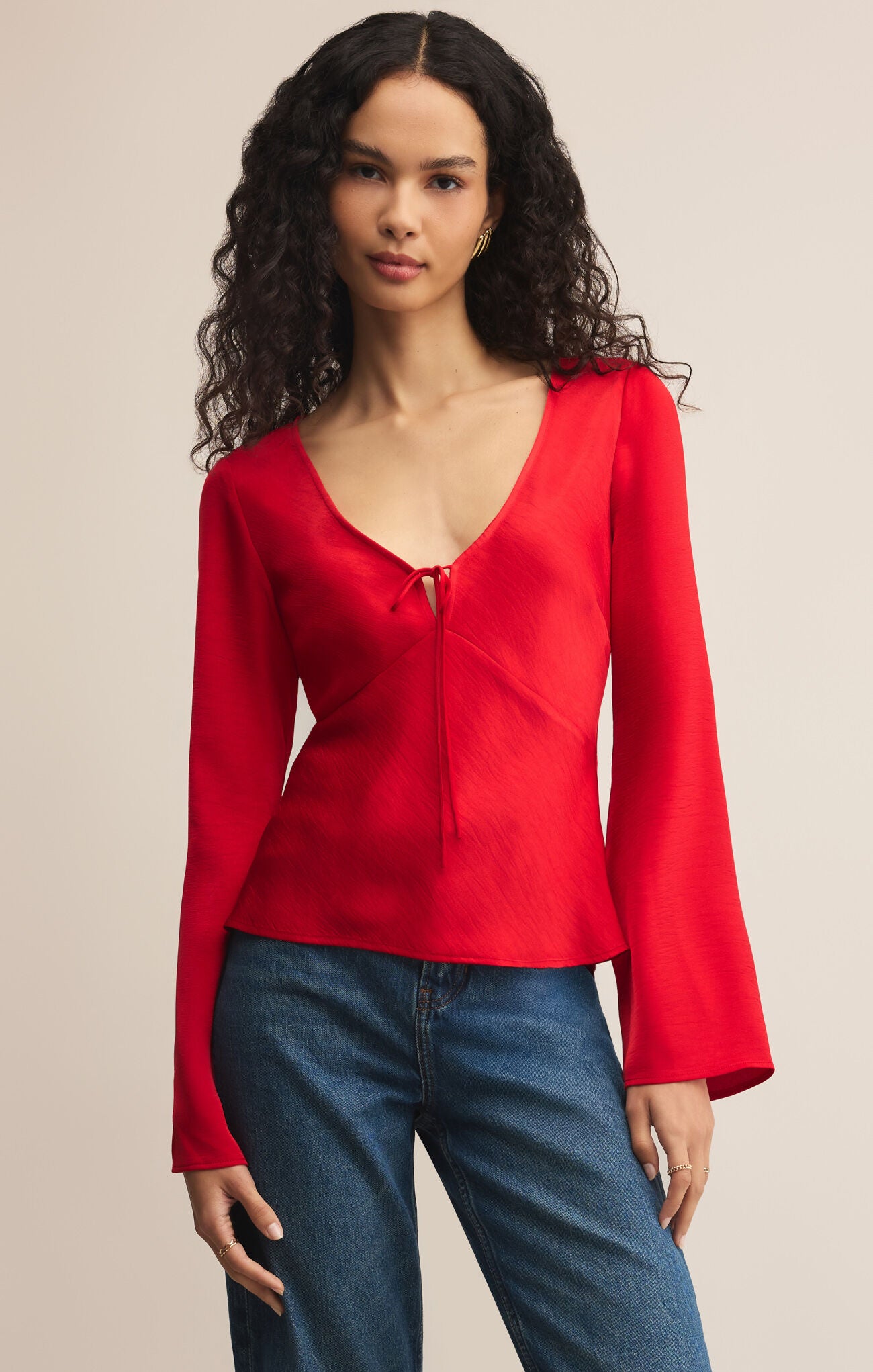 Elevate your everyday style with this vibrant red long-sleeve top, designed with a soft sheen and a flattering, feminine silhouette. The deep V-neckline is accented by a delicate front tie, adding a subtle romantic touch. Gently flared sleeves create graceful movement, while the fitted bodice skims the waist for an effortlessly chic look. Perfect for pairing with denim or dressing up for a night out, this top brings a bold pop of color and timeless elegance to any outfit.