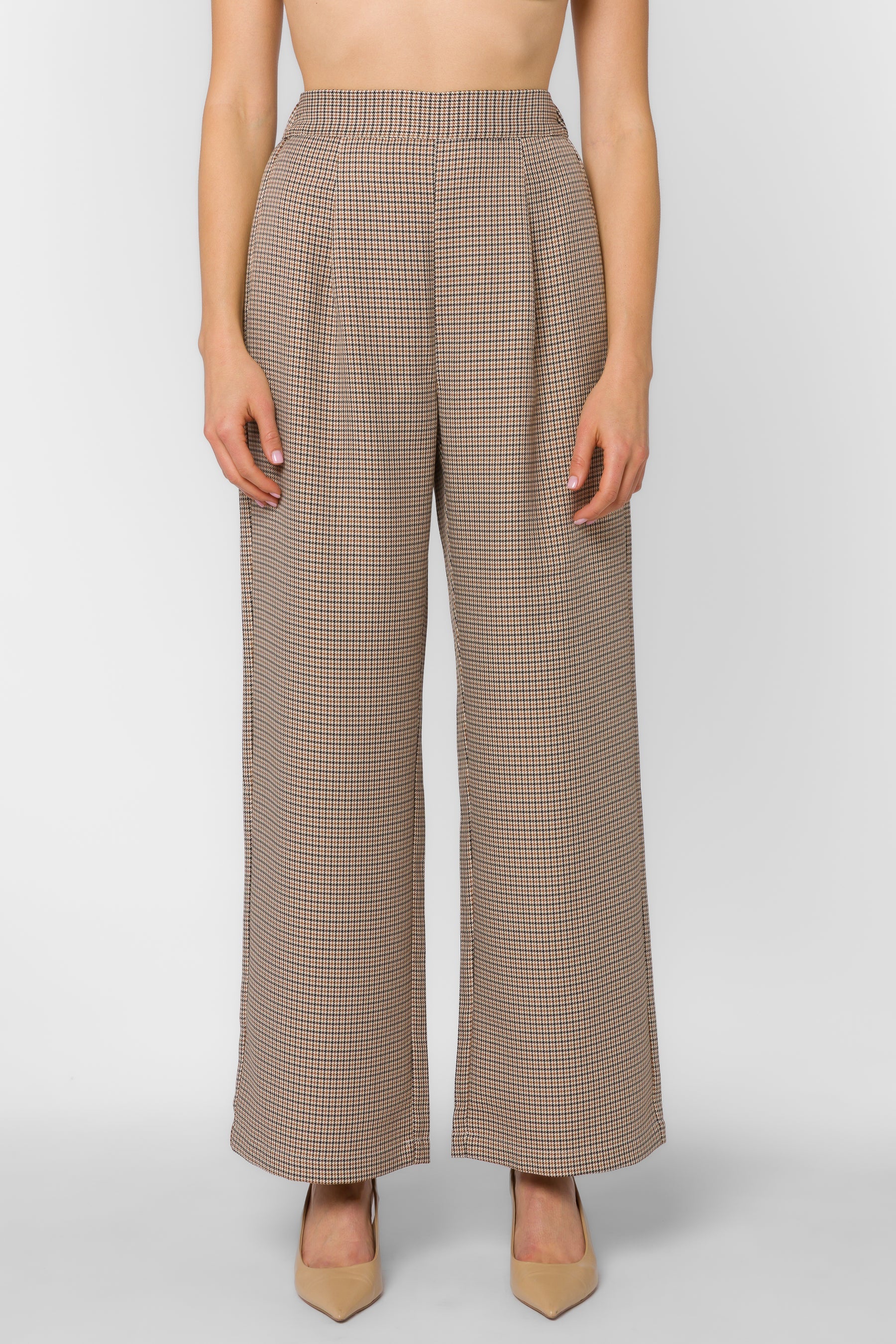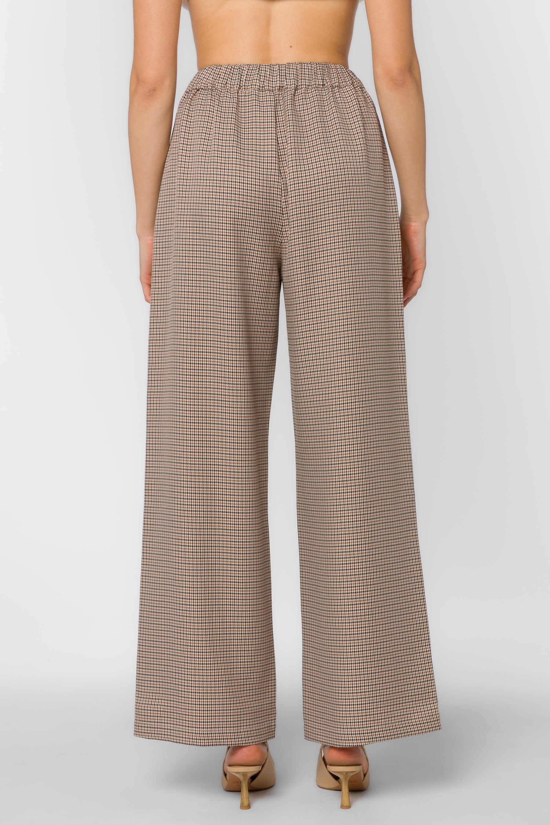 These plaid wide-leg trousers bring modern tailoring to your everyday wardrobe. Designed with a high-rise fit, relaxed drape, and subtle pleating for movement, they strike the perfect balance between comfort and sophistication. The neutral plaid print adds timeless appeal, while side pockets make them as functional as they are stylish. Pair them with the matching blazer for a power-suit moment, or dress them down with a simple tank and loafers for an elevated casual look.
