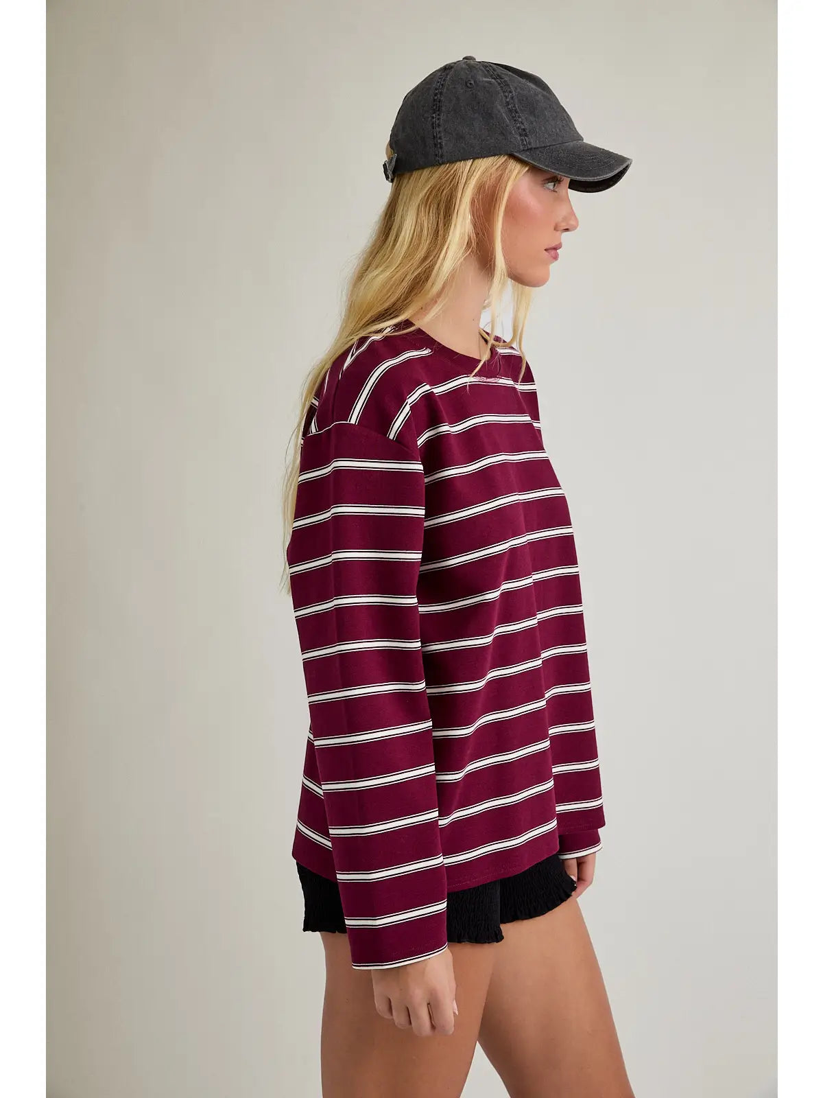 Elevate your casual wardrobe with this effortlessly cool Burgundy Striped Long Sleeve Top. Featuring a rich burgundy base with crisp white horizontal stripes, this relaxed-fit top combines timeless style with everyday comfort. The soft knit fabric drapes beautifully, while the dropped shoulders and wide sleeves add a modern, laid-back vibe. Perfect for pairing with denim, shorts, or layering under jackets, this versatile top transitions seamlessly from season to season.