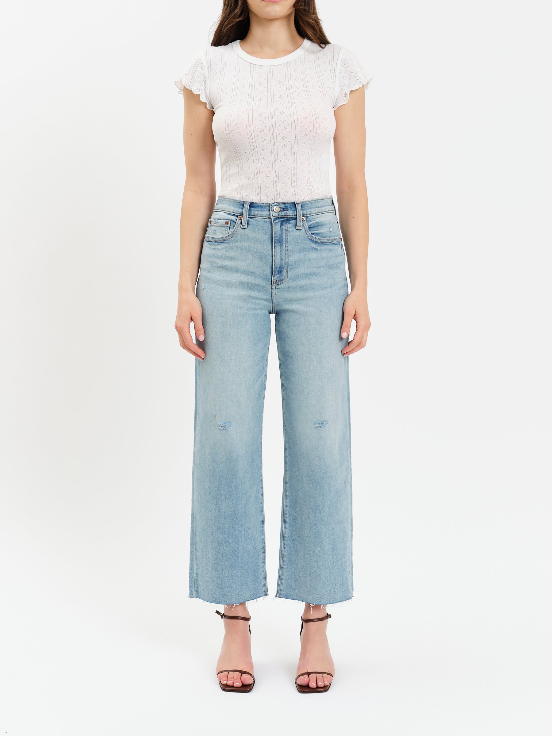 This jean aims to please. In an easy wide leg with a scissor cut hem, this waist defining high rise features fading and a light wash with highs and lows. Constructed in our Hug denim, has form flattering stretch while still keeping the vintage inspired wide leg fit.