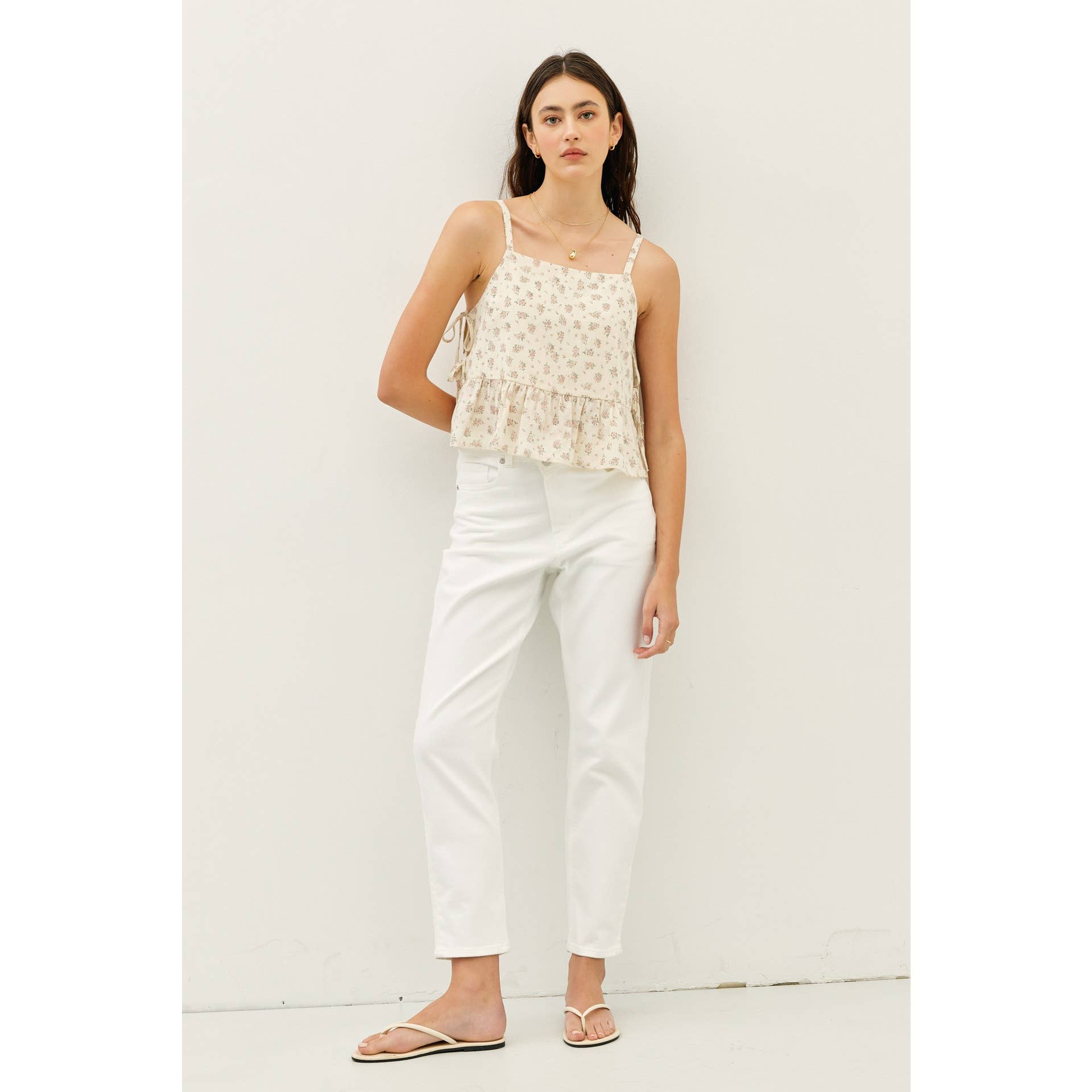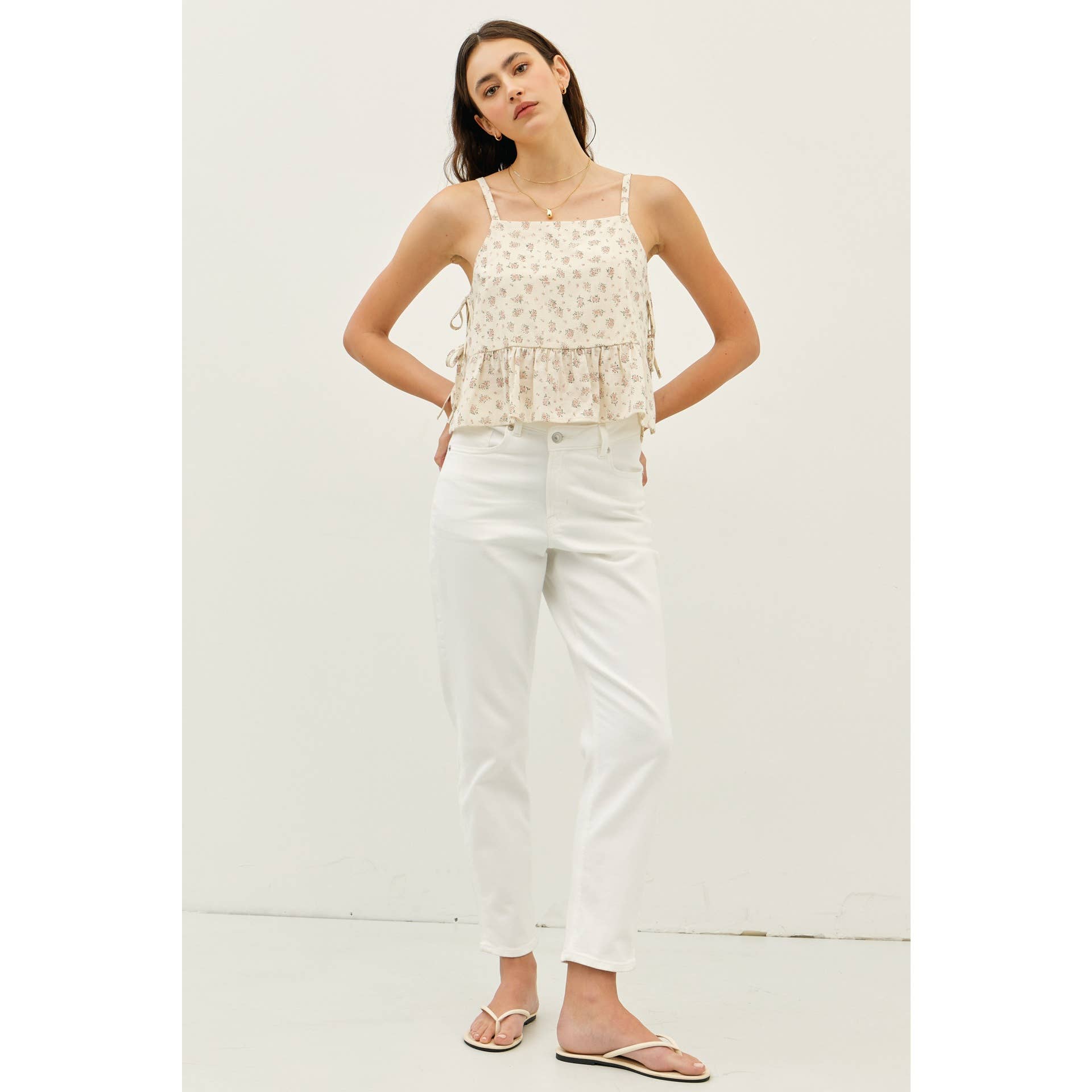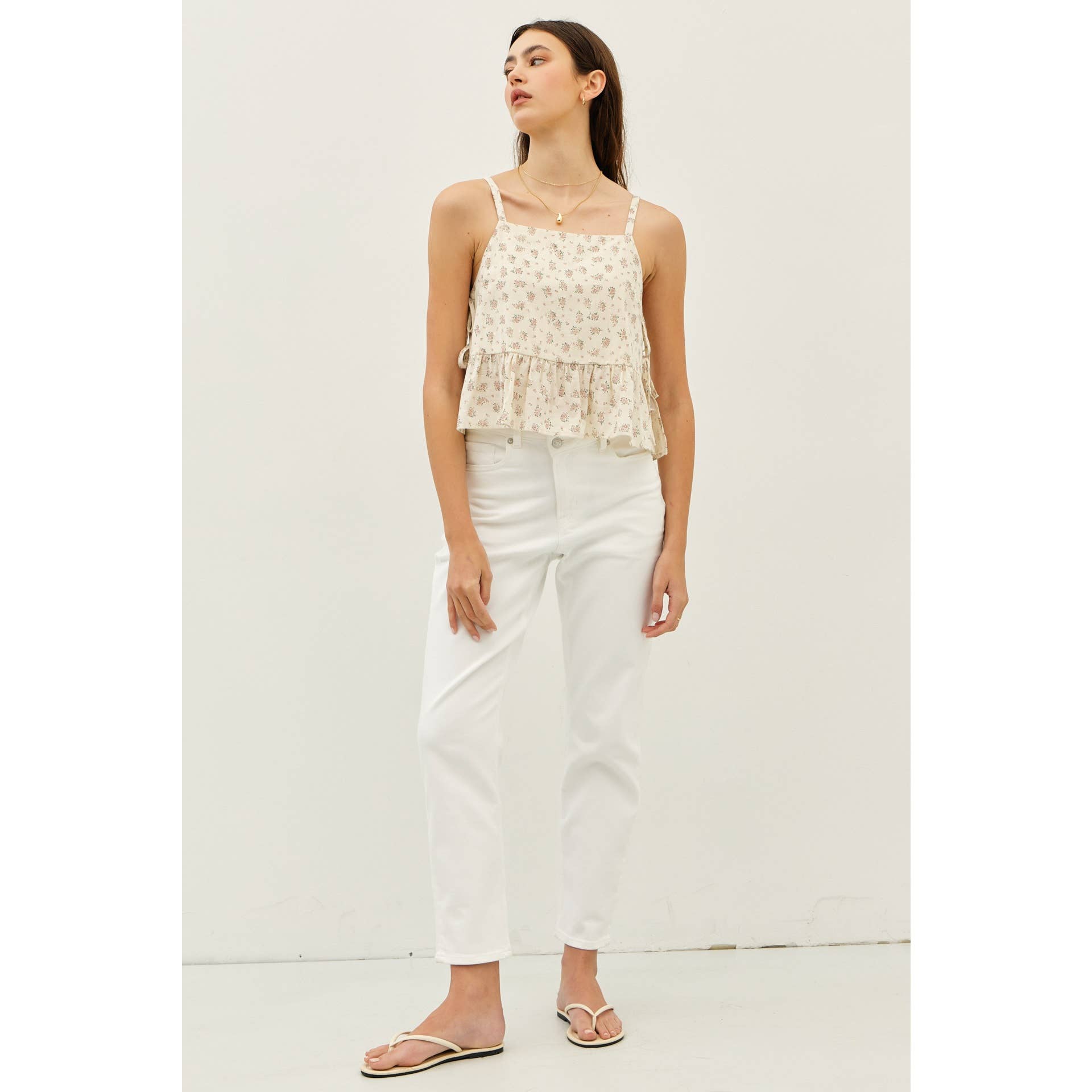 Effortlessly feminine and perfect for warm-weather days, this romantic tank top features a delicate floral print on a breathable cotton-linen blend. Designed with a flattering ruffled hem and charming side tie closures, it offers a customizable fit with adjustable straps. The fully lined bodice ensures comfort and coverage, making it as practical as it is pretty. Ruffled hem, side tie closures, adjustable straps, fully lined