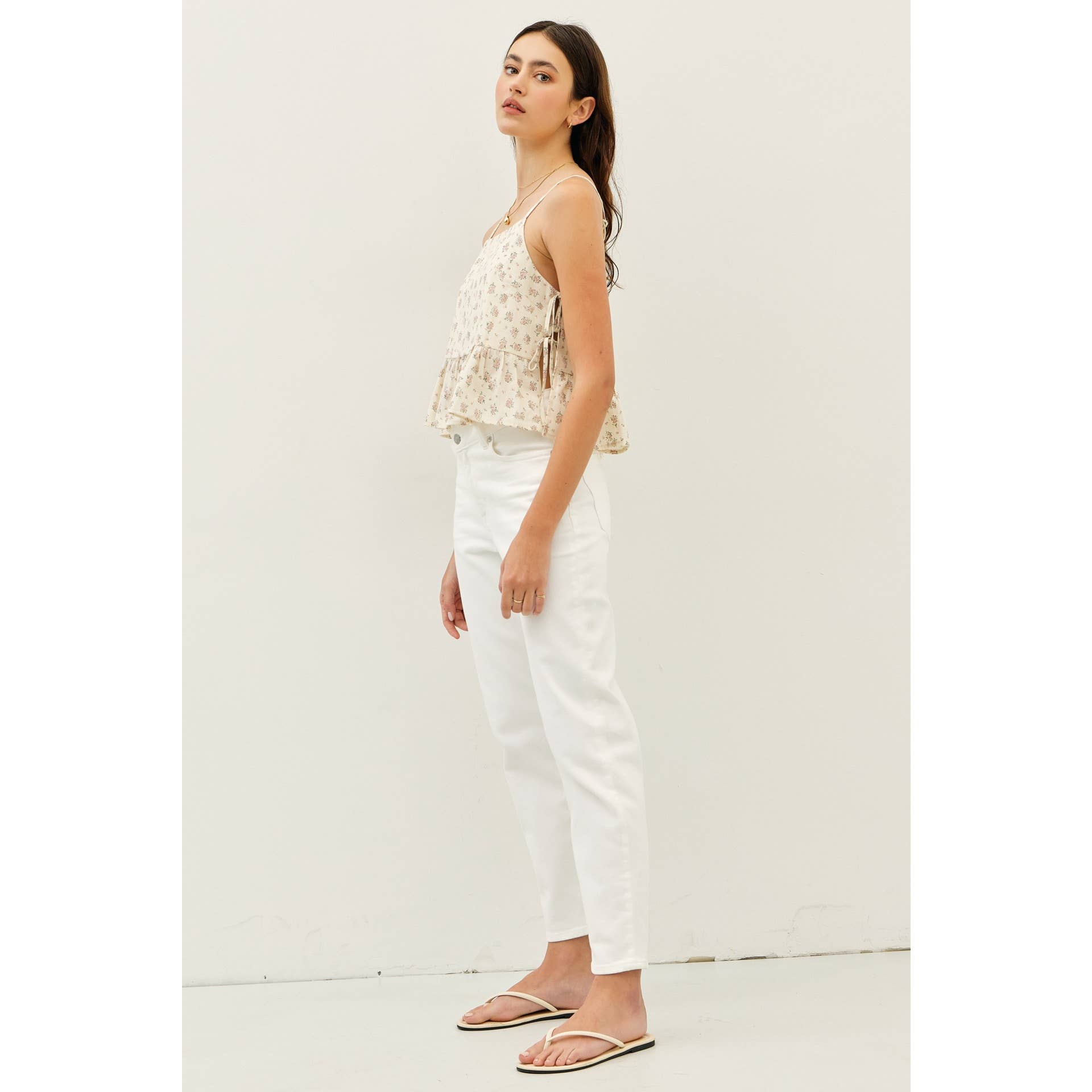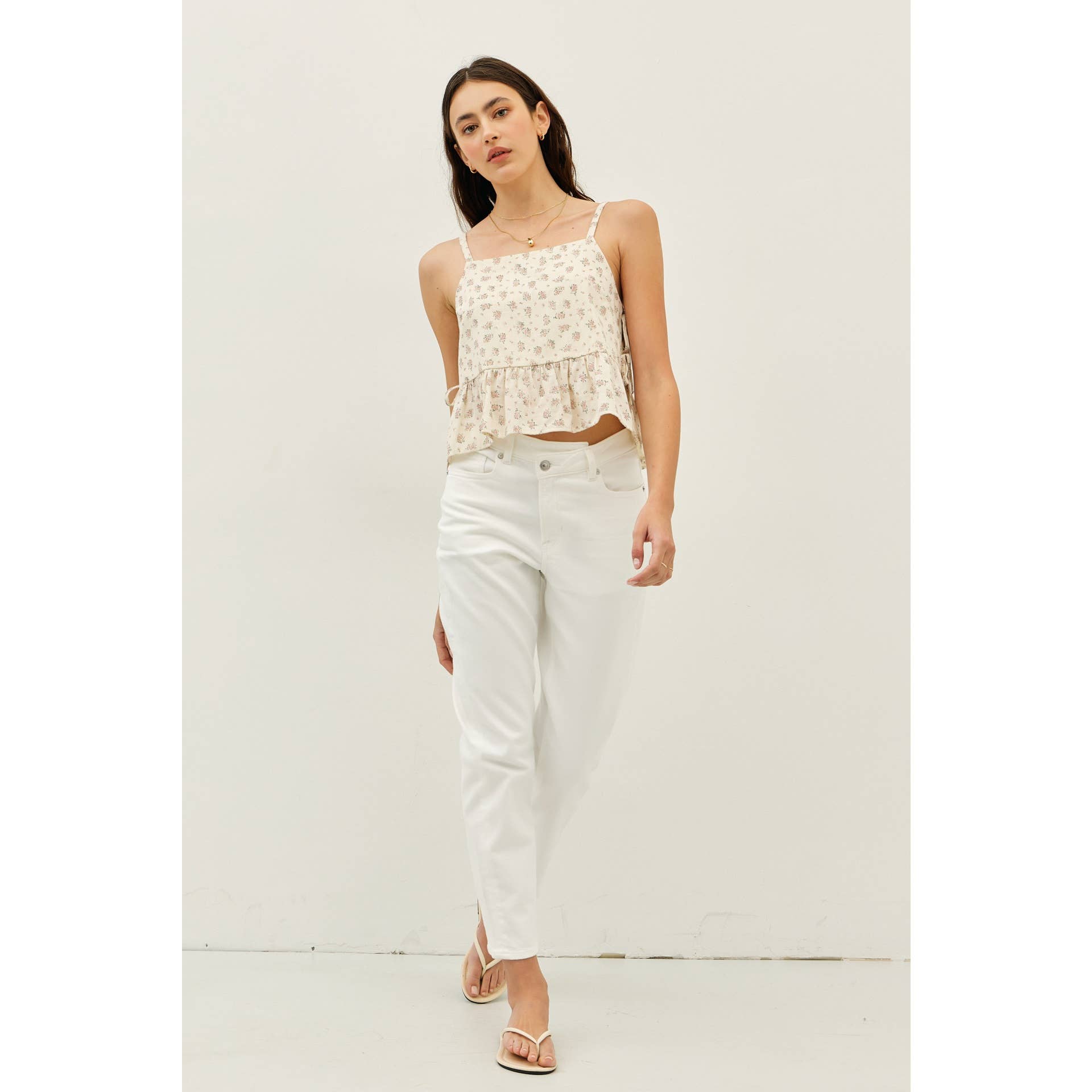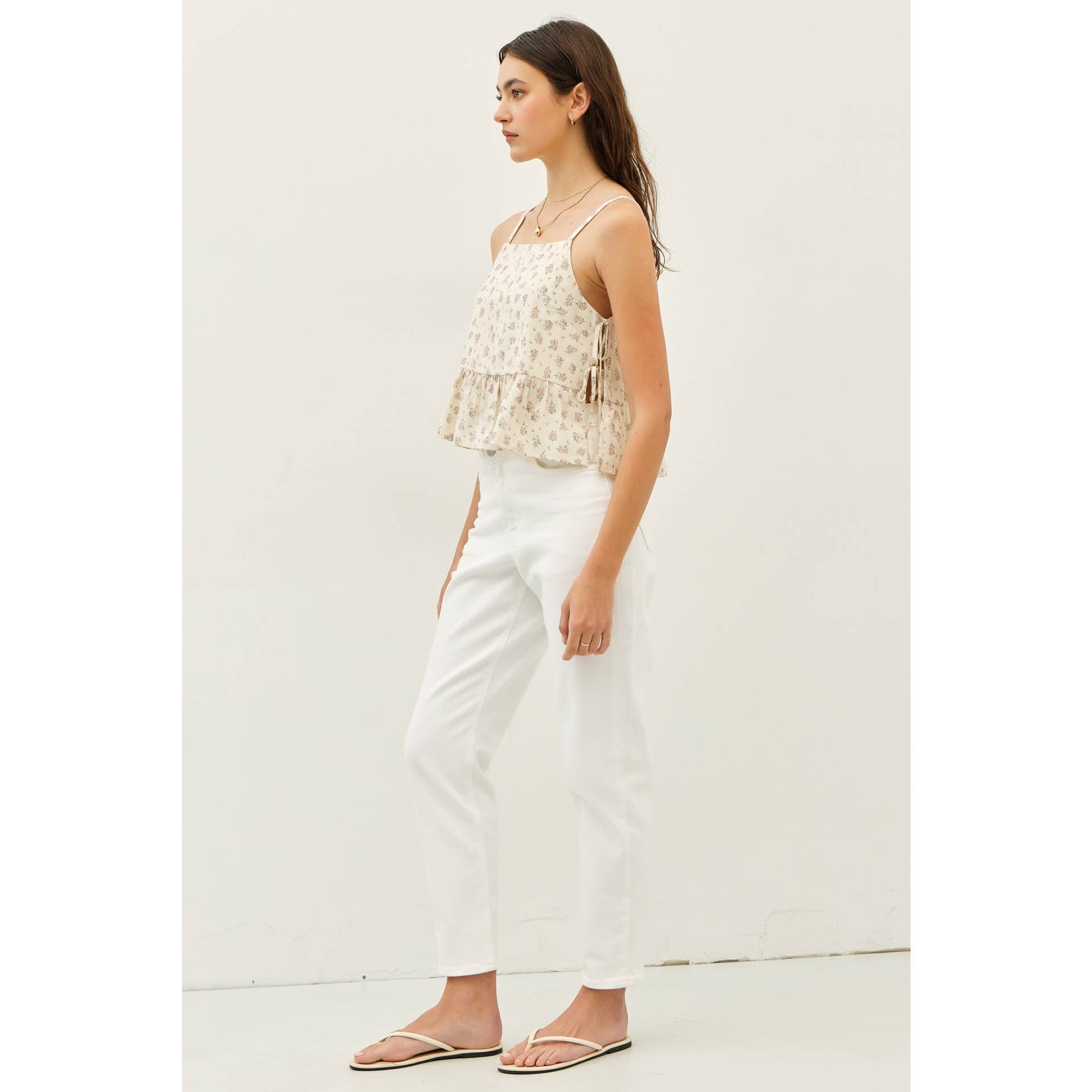 Effortlessly feminine and perfect for warm-weather days, this romantic tank top features a delicate floral print on a breathable cotton-linen blend. Designed with a flattering ruffled hem and charming side tie closures, it offers a customizable fit with adjustable straps. The fully lined bodice ensures comfort and coverage, making it as practical as it is pretty. Ruffled hem, side tie closures, adjustable straps, fully lined