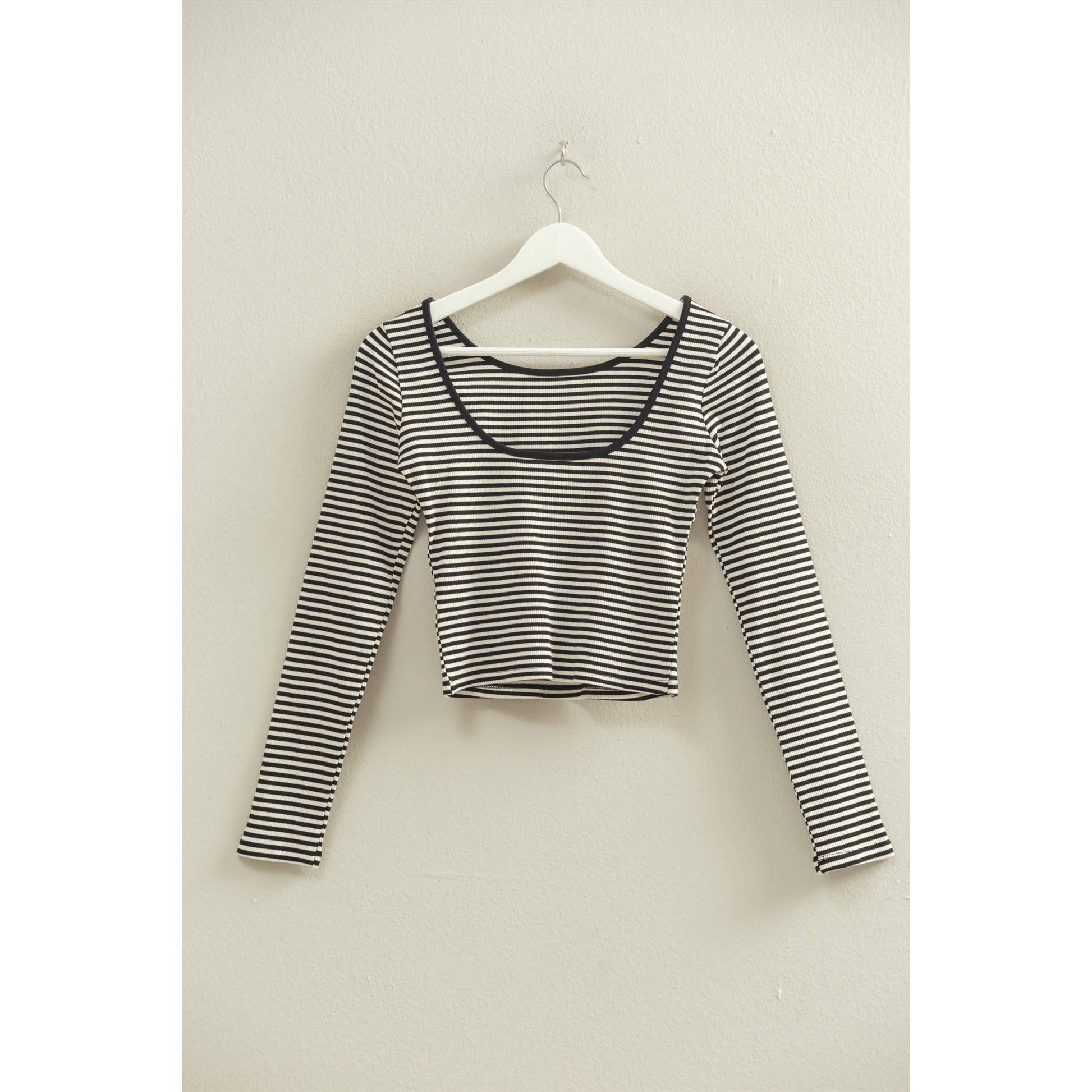 Timeless and versatile, this long sleeve top features a chic stripe pattern and a flattering scoop neckline for a laid-back yet polished look. Designed to lightly hug the body with a soft, stretchy blend of 95% cotton and 5% spandex, it offers both comfort and style. Perfect for layering under your favorite denim jacket or casual blazer, this go-to piece effortlessly adapts to any occasion.