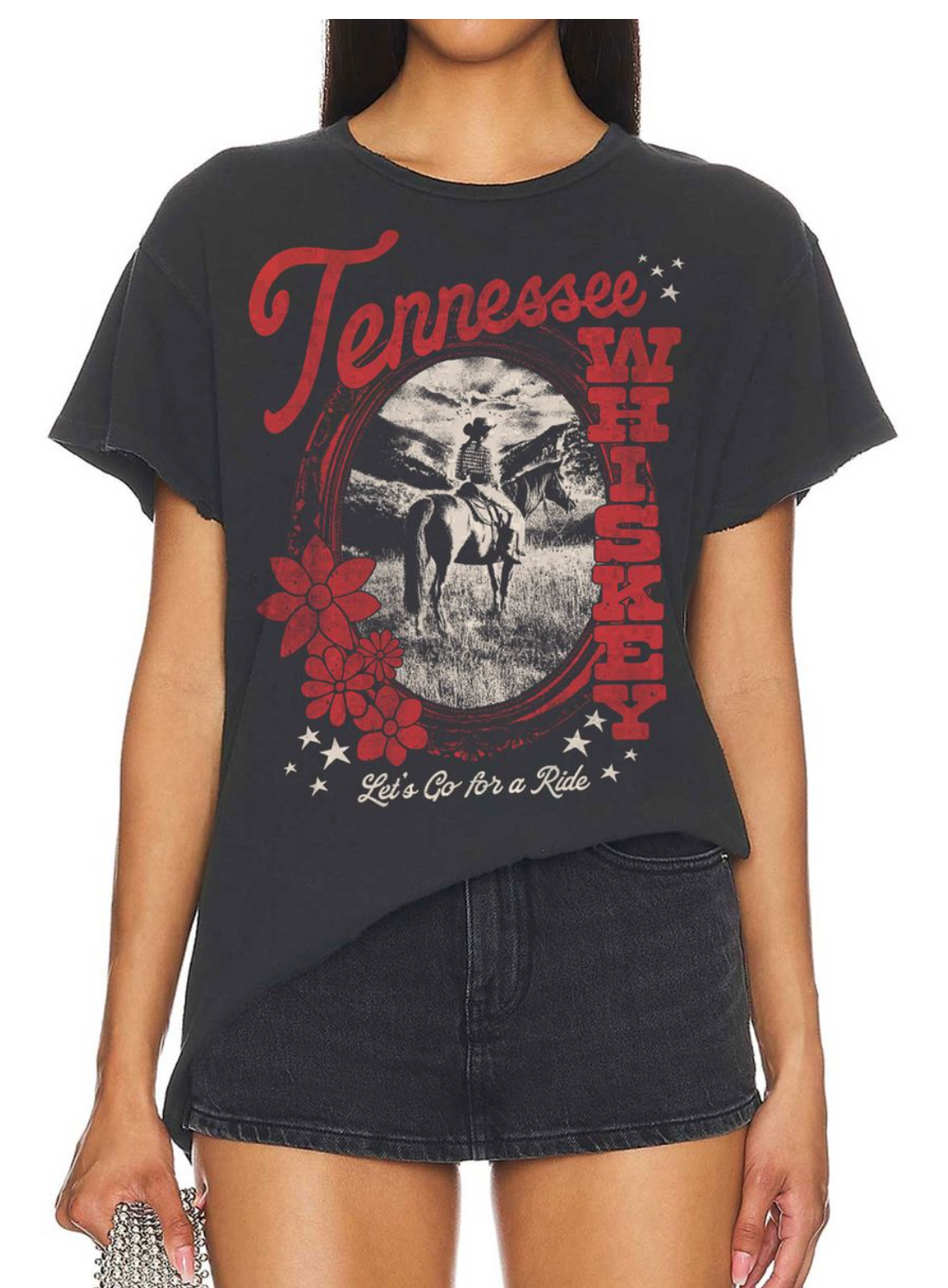 This black graphic tee features “Tennessee Whiskey” in classic Western-style lettering, giving it a rugged yet stylish edge. Crafted from soft, breathable cotton with a lived-in feel, it's perfect for pairing with denim, boots, or a leather jacket for that effortlessly cool, Southern-inspired look.