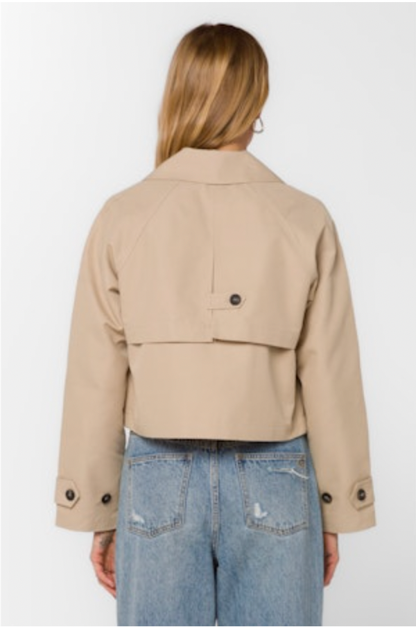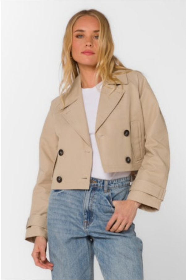 The double-breasted front button closure adds a refined touch, while the cropped length gives it a contemporary, fashion-forward edge. Finished with long sleeves, a structured collar, and trench-inspired detailing, it’s the perfect layering piece for transitional weather.